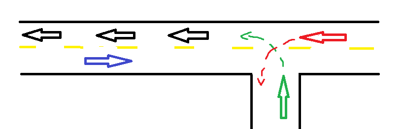 А вот по дороге домой чуть не попал в аварию. Скорее всего по своей вине, а может не только по своей. Судите сами по диаграмме: я зелёный хочу повернуть из улочки налево, на главную улицу в поток машин. Вижу что последняя, красная скоро проедет и я успею проскочить перед тем, как до меня доедет синяя. Красная едет безо всяких сигналов поворотника, и я уже начал двигаться и поворачивать налево, а она вдруг решила сама повернуть налево на мою улочку. Я резко торможу и она проезжает буквально в одном миллиметре (как мне показалось) от моей. Как говорится, чудом не зацепился. Включайте иногда поворотник пидарасы! Ну, хорошо что всё обошлось.