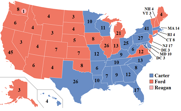 Сегодня рассматривал электоральные карты с прошлых выборов. Полюбуйтесь, например, картой времён Джимми Картера: Техас и вообще весь Библейский пояс голубые (то есть за демсов), а Калифорния и весь западный берег наоборот красные, то есть за респов. Как всё поменялось, однако!